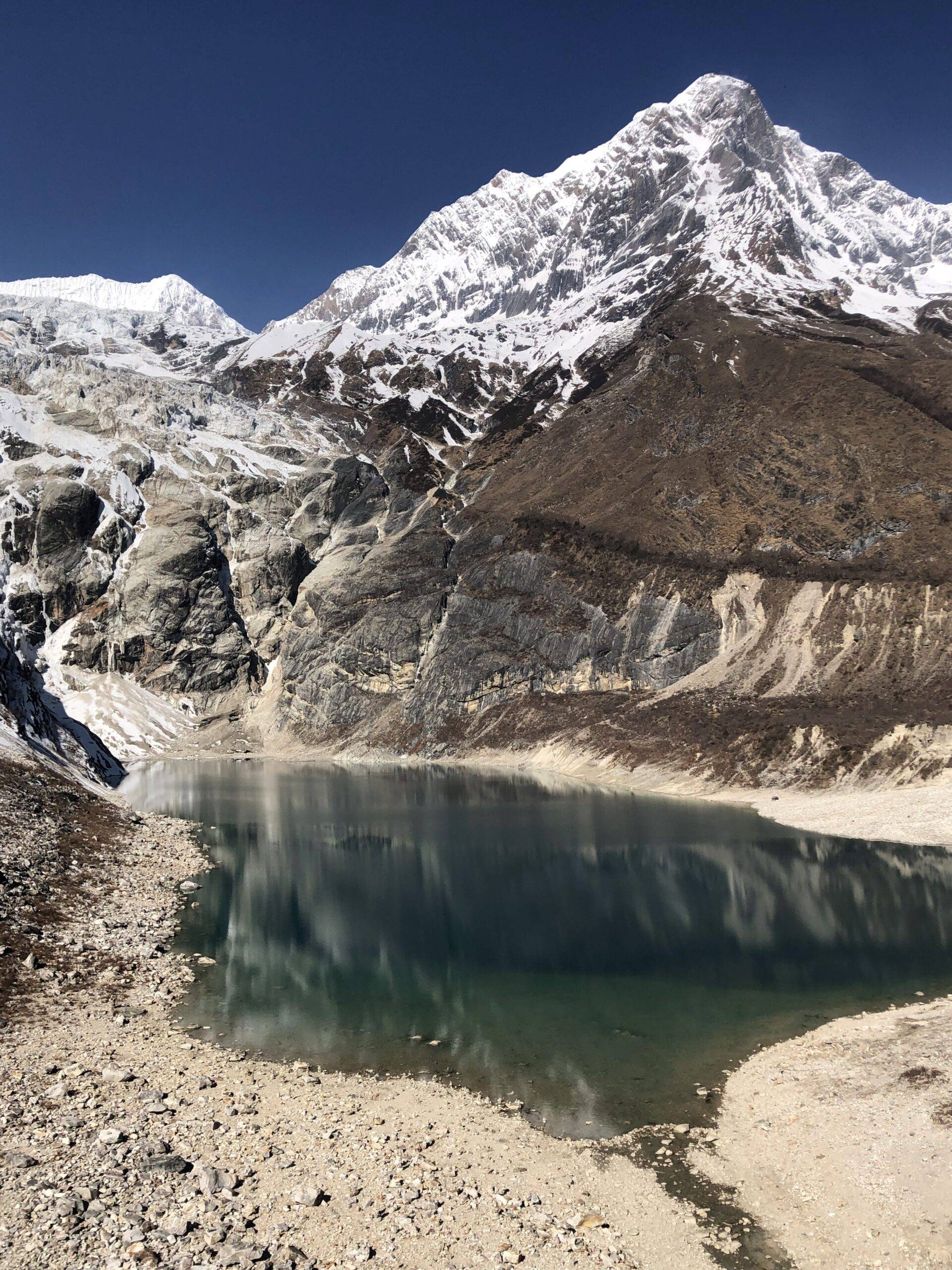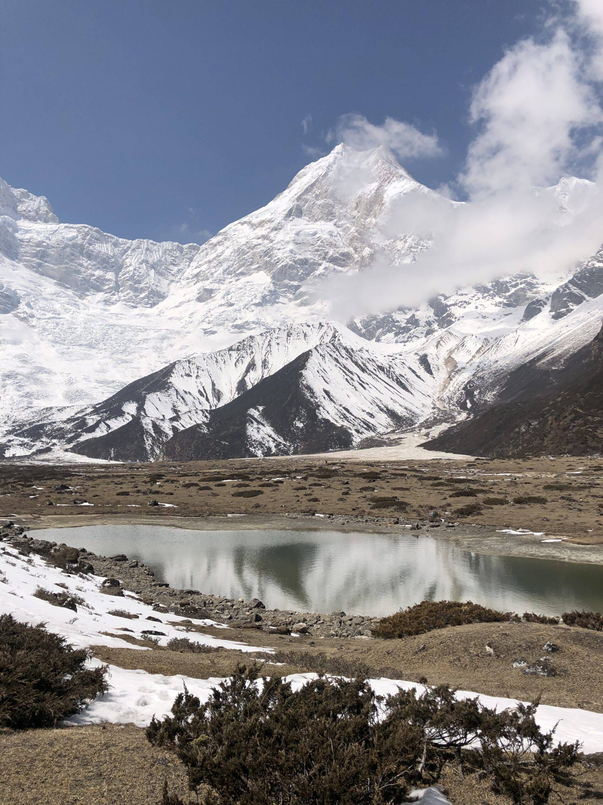 La « montagne sacrée » du Manaslu domine chaque pas à travers les forêts de genévriers. Au lac Birendra Tal, l’eau de fonte turquoise reflète les séracs déchiquetés du glacier comme du verre liquide. Selon la légende locale, la profondeur du lac est reliée au monde souterrain : jetez une pierre tout en faisant un vœu.